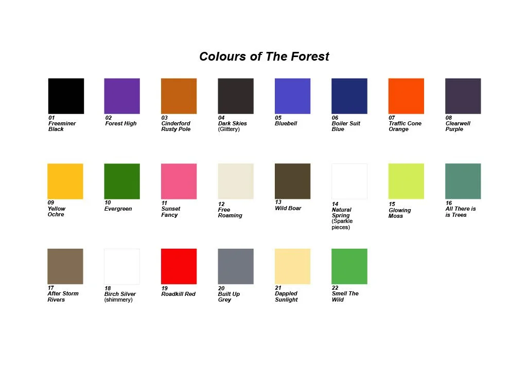 The colour palette of nail polishes specific to the Forest of Dean was a project originally commissioned for FOD Fringe in 2024. The bespoke colour palette was developed and informed through a series of sessions led by the artist and working with year 11 at SGS Forest High School, Cinderford, the Hilltop Craft group with Two Rivers and wider community members.